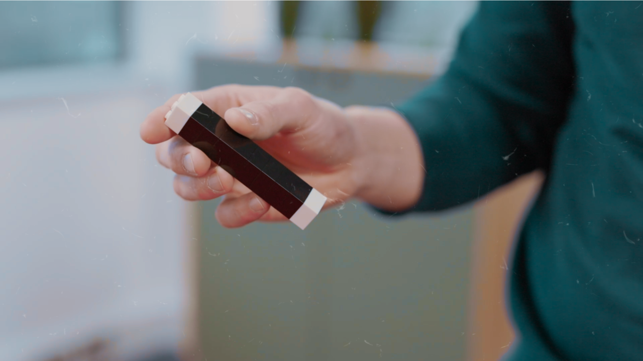 You introduce a magic wand constructed from colorful toy bricks. With a casual wave, a white brick vanishes from the end of the wand and reappears in your free hand. You take the wand apart to show it’s nothing more than ordinary bricks—then the magic keeps going. A brick disappears from one hand and pops into the other, joining its twin.