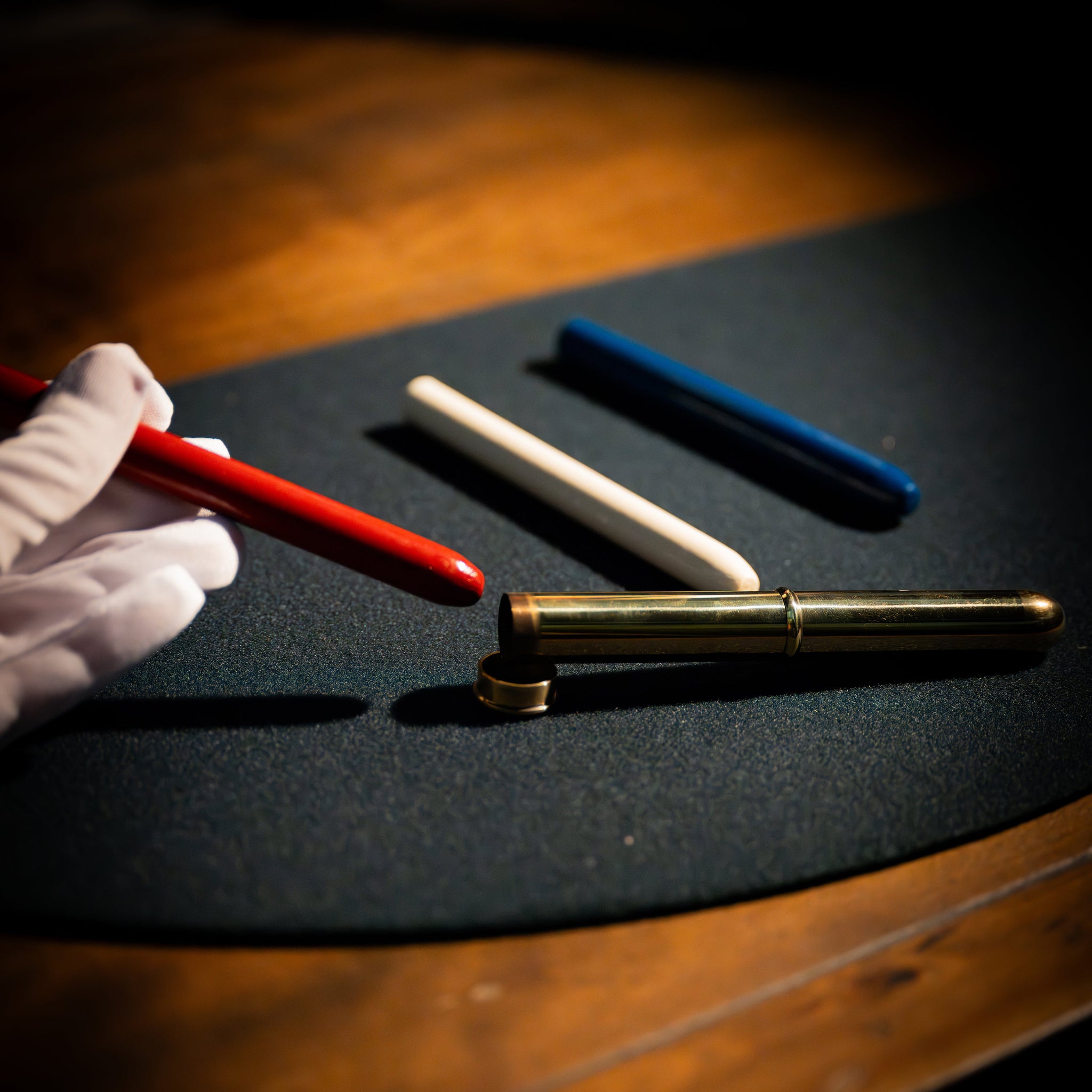 Three brightly colored rockets—red, white, and blue—are shown. With your back turned, a participant freely chooses one and places it into the polished Telepathic Tube, sealing it with the cap. The remaining two rockets are locked away inside a separate black box. No peeking. No signals. No funny business.