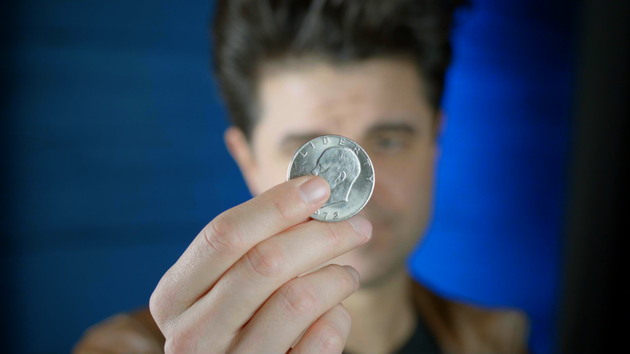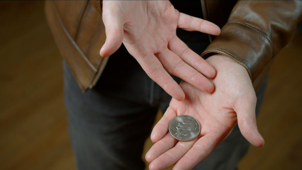 The magician displays a dollar coin front at back. They place it on their open palm. With a wave of their hand, the dollar coin transforms into two brightly colored poker chips. With another wave of the hand, the magician is able to transform the poker chips back into the coin and hand it out for examination.
