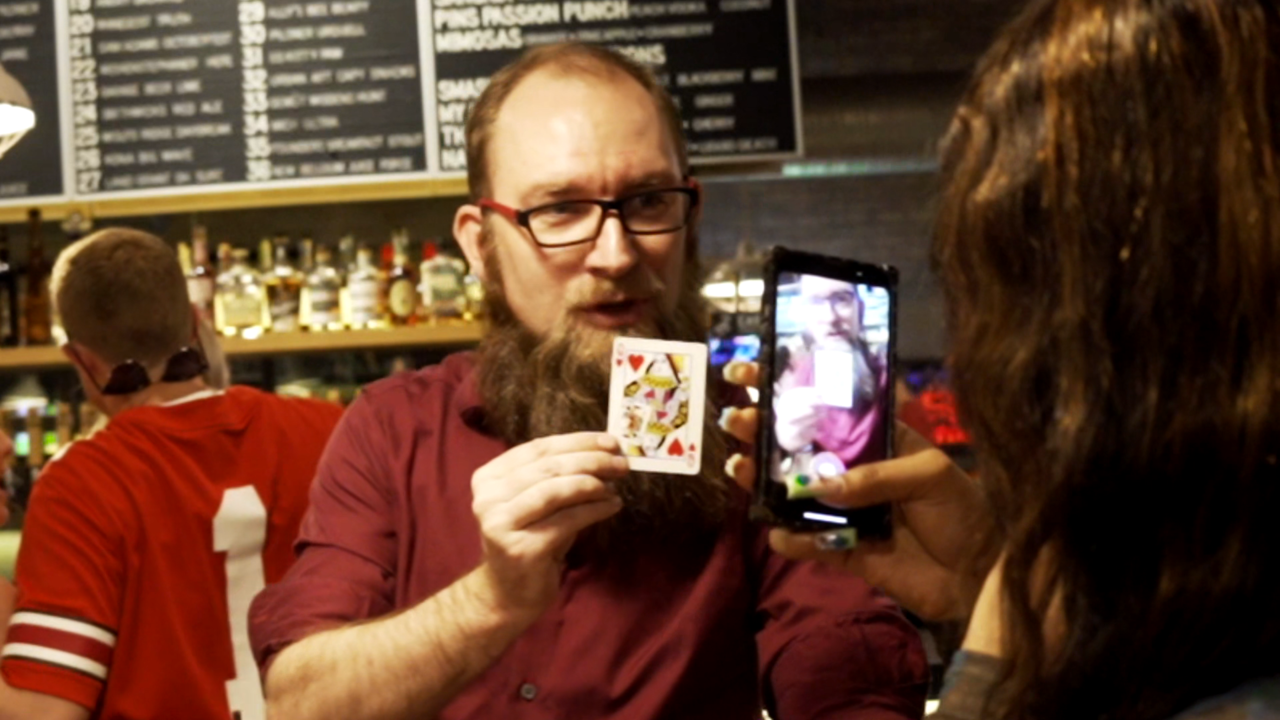 Three different cards are freely selected and lost in the deck. You spread the cards… and one turns face up by itself. The first revelation lands clean.