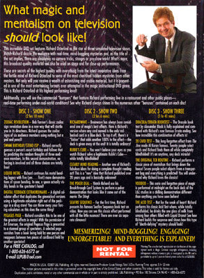 Both Richard and Jim feel that all TV magic and mentalism should be free of camera and editing tricks. This was always the unbreakable rule during the Golden Age of Television. Together, they conceived the idea for this DVD series in order to demonstrate that a television performance can be intriguing, amazing and entertaining without outside help from the special effects crew!