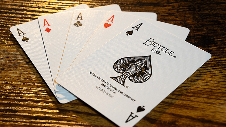 Four cards are displayed face up. One of the cards is freely selected by a spectator. The chosen ace is revealed to be "odd" because it's the only card with a RED back! ALL of the other backs are BLUE-backed!