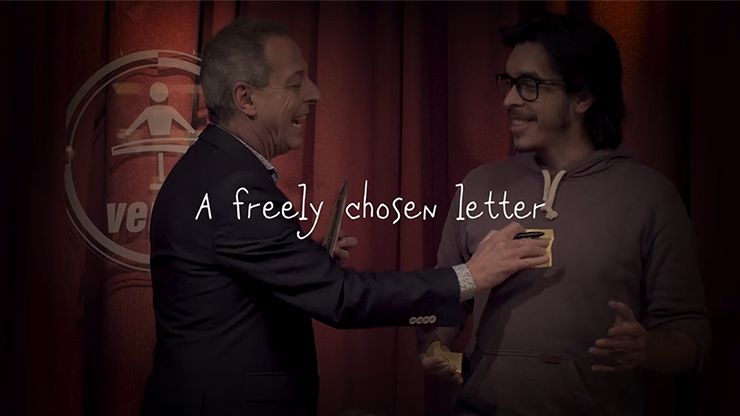 The yellow envelope is opened, and a smaller plastic grey envelope is removed. It has a big printed label that says, "Choose a letter." The magician asks Tom to point to another spectator in the audience to choose any letter. After he calls it aloud, it is written on a sticky note and stuck onto Tom's chest.