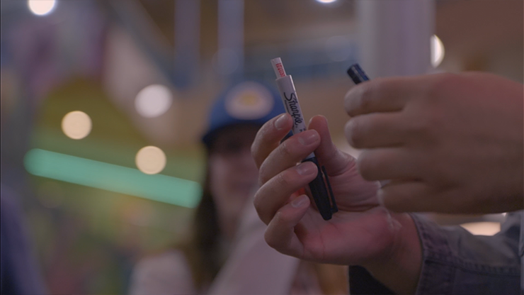 You take the sharpie from the spectator, and WITHOUT ANY MOVES, and while keeping the Sharpie IN VIEW THE ENTIRE TIME...you open it up to REVEAL a card rolled up inside.