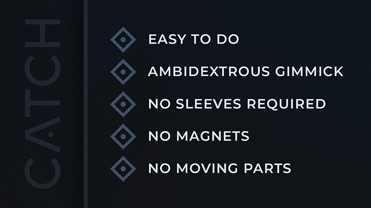 Once the coin is secure in the "Catch" gimmick, an innovative locking system keeps it secured in place until you wish to release it. That's right. "Catch" not only vanishes coins, but allows you to produce them as well-making it the perfect utility for transpositions, changes, or any of your other favorite coin tricks.