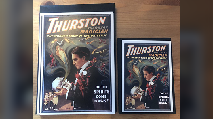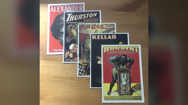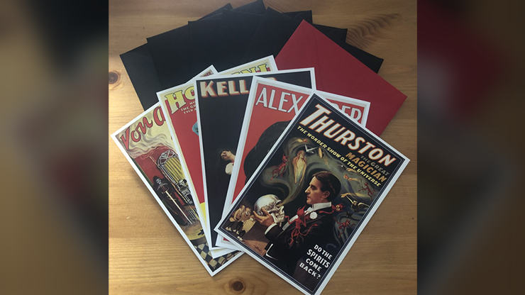 You bring out a mysterious red envelope which you leave in full view, and five gorgeous full-color postcards, which show five famous magicians from years gone by - there's Thurston, Kellar, Alexander, Vonarx and Houdini. Each one is in a black envelope, and a spectator freely mixes them together.