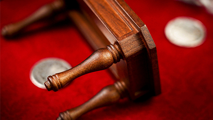 You show a small ornate wooden table that can be handed out for examination. You then introduce 4 half dollars and one by one cause the coins to visibly penetrate the table with no cover. At the end of the performance, you drape black silk over the table and with a gentle press cause the table to penetrate the working surface or vanish entirely.