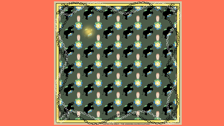 Inspired by a lithographed poster by the Otis Litho Company, Cleveland, OH; this "Pocket Devil" features the jewels from Carter's exotic turban, influenced no doubt by his lengthy and numerous tours in the Far East; the chains which hoisted the elephant, both before and after the vanish and the silhouette of the elephant itself.