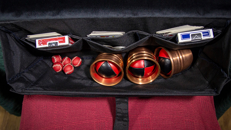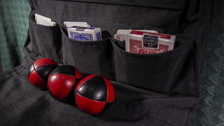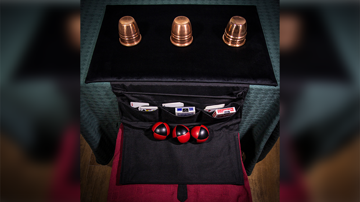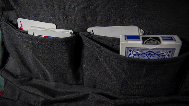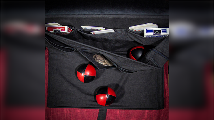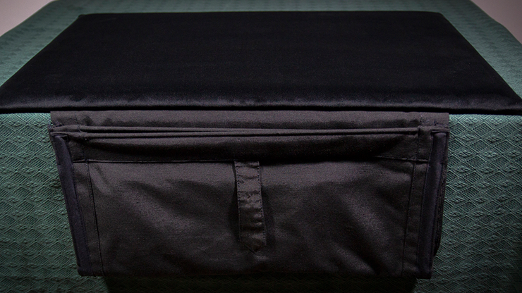 It has a high-durability fabric, and it is attachable under any mat. It is made up of two sections that are easy to open and close thanks to eight neodymium magnets: one section for use in parlor magic and another for use in close-up magic. Each of these sections comes with six huge separate pockets where you can load and download almost anything. The servant's internal structure allows you to have your legs completely relaxed while performing magic. Its plastic tongue allows you to anchor it to the waist to keep the base of the servante always at the same distance from you. It also comes with an adherent foam that doesn't allow it to move at all. It comes with an introduction video of the author Elías D'Sastre and also tips and tricks of the FISM winner Luis Olmedo who is the best in the world using Elías' D'Servante.