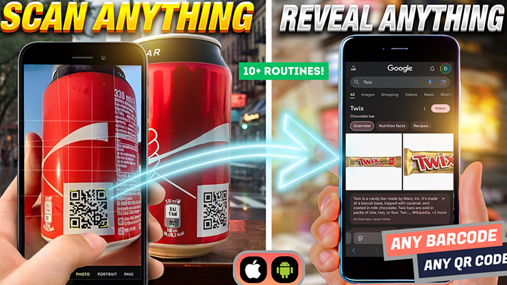 In the featured routine, you display a barcode and ask your participant to guess what item that is from. They write down ANY ITEM they think of on the back of a business card (or in the Notes app) and show it around. It is a completely free choice with unlimited possibilities. You now scan the barcode and unbelievably it leads to a Google result for the precise item they thought of. If you prefer, you can even have the item revealed in the Amazon or Walmart apps! This miracle also works with QR codes, so you can expand the possibilities infinitely to any celebrity, movie, band, event... literally ANYTHING!
