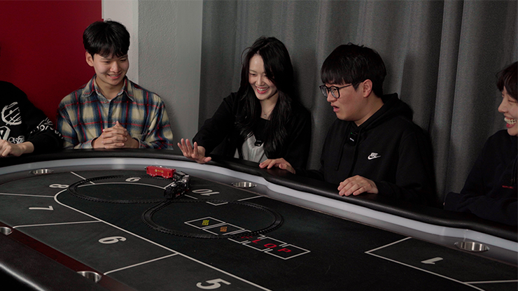 A toy car moves and then stops on its own. Look at the card where it stops, and it's the spectator's card. -