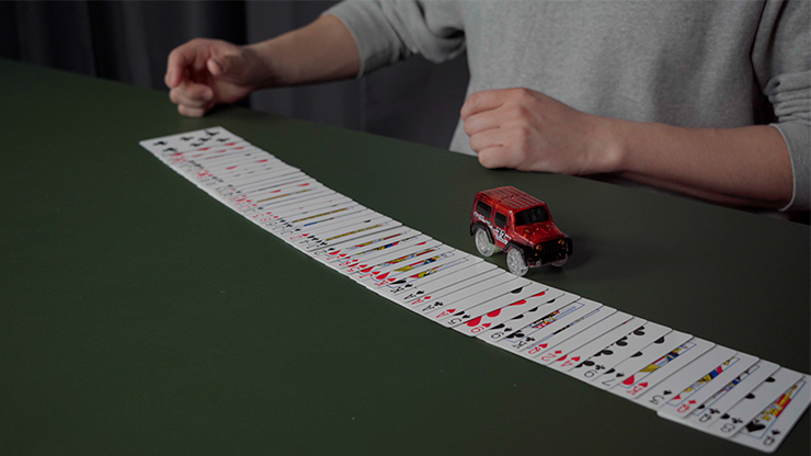 A toy car moves and then stops on its own. Look at the card where it stops, and it's the spectator's card. -