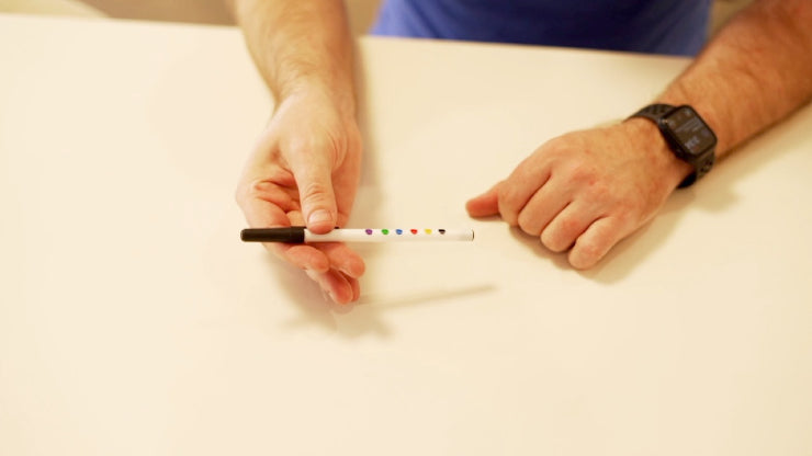 You show a normal ballpoint pen, decorated with six colored dots. Your participant freely names any number from one to six. With just a wave, every single dot on the pen instantly changes to match their chosen color. A shake brings back the rainbow, then — as if defying logic — the dots transform again, showing all one color on one side and a rainbow on the other.